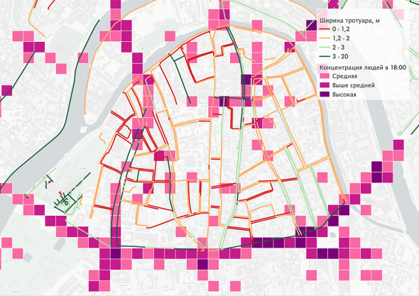 На примере кейса районов Якиманка и Замоскворечье можно рассмотреть, как анализ активности людей в разное время суток может быть применен в московских реалиях и позволит выделить загруженные места, пустоты, мигающие локации (резкие перепады от высокой активности до пустоты). Если данные об активности горожан наложить на данные о ширине тротуаров, то получается, что в зоне риска находятся пересечения улицы Малая Якиманка и Полянского переулка с улицей Большая Якиманка; квартал вокруг метро «Полянка» — Большая Полянка в районе Бродникова переулка и 2-го Полянского переулка, включая сами переулки; 1-й Хвостов переулок в районе Большой Полянки; Якиманский проезд от Большой Якиманки до Большой Полянки по нечетной стороне, Большая Полянка до Якиманской набережной по четной стороне.